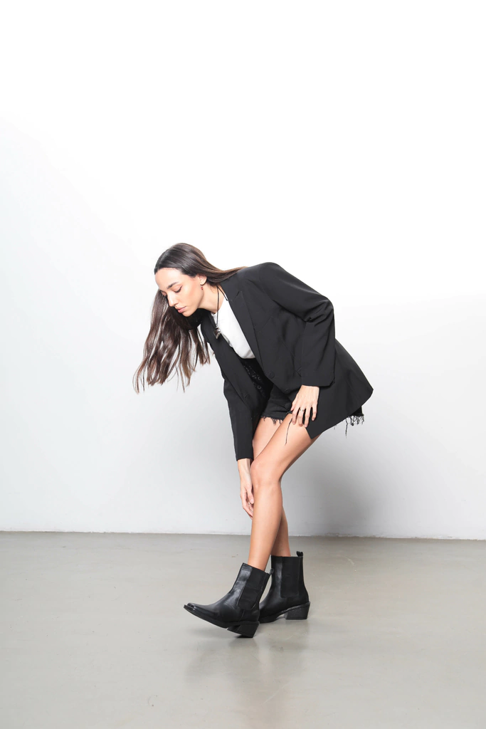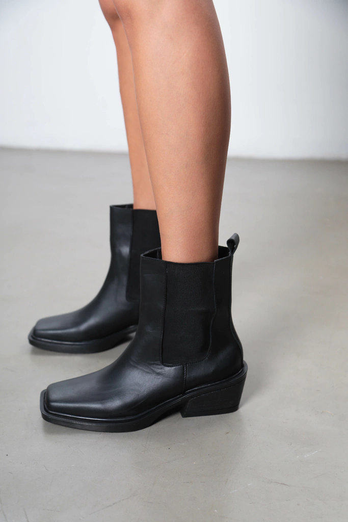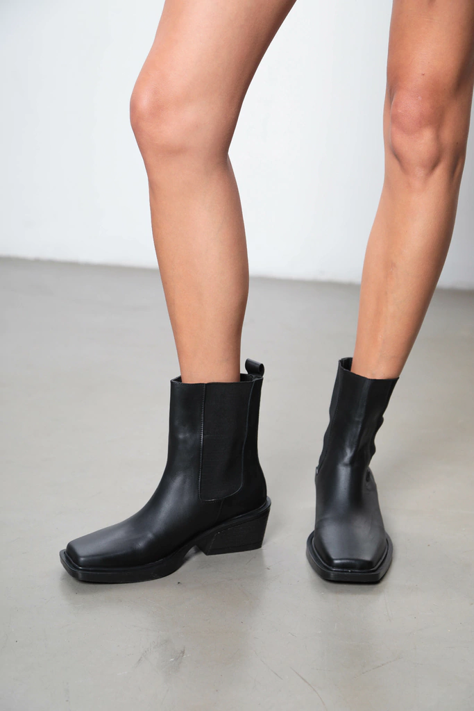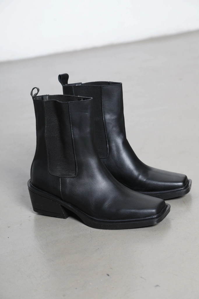 Bota confeccionada en cuero vacuno con punta cuadrada y elastico negro en ambos laterales