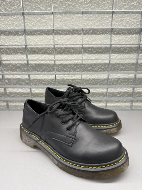 Mocasin confeccionado en cuero vacuno con cordon y ojalillos color negro, la base viene con costura amarilla.
