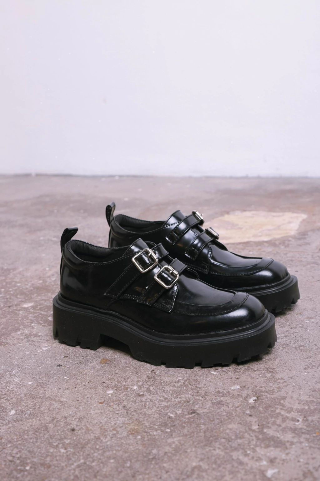 Mocasin confeccionado en cuero vacuno (alto brillo) con hebillas niqueládas.