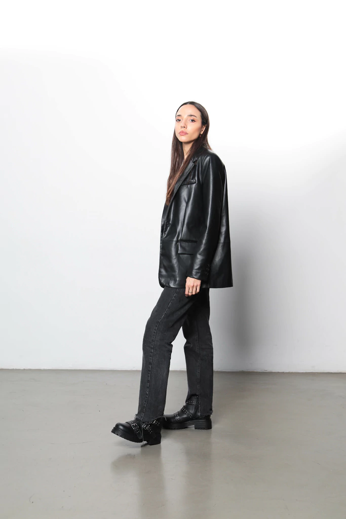 Borcego confeccionado en cuero con hebillas y apliques color niquel + cierre lateral negro