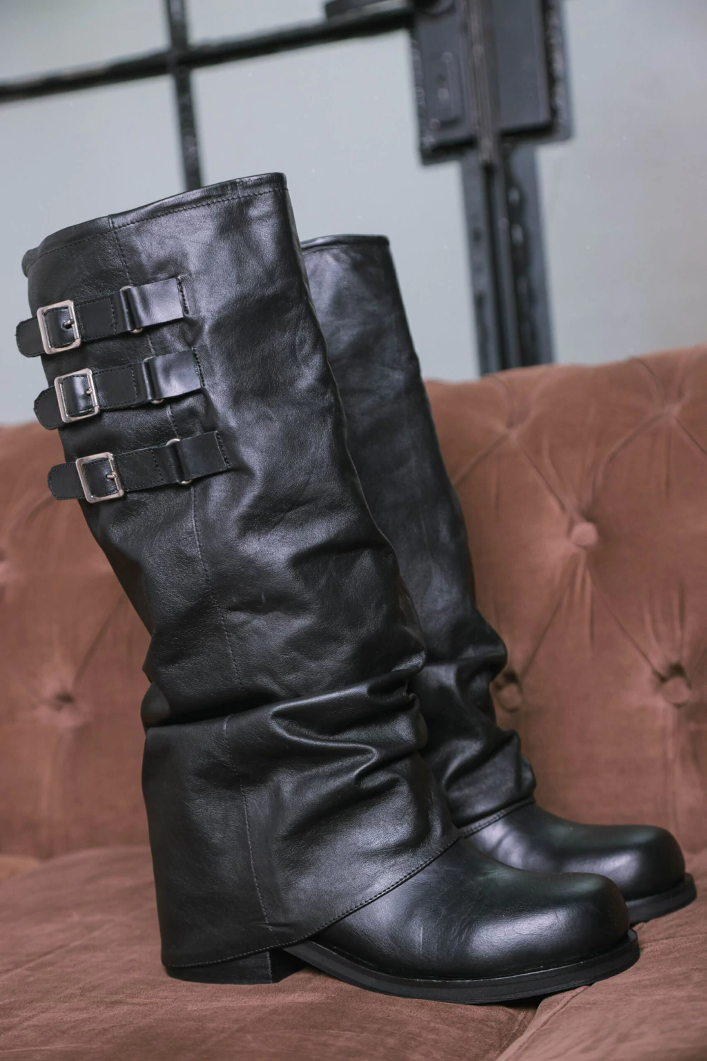 Bota caña alta  confeccionada en cuero vacuno con pliegue efecto arrugado y hebillas niqueládas con fondo 100% artesanal.