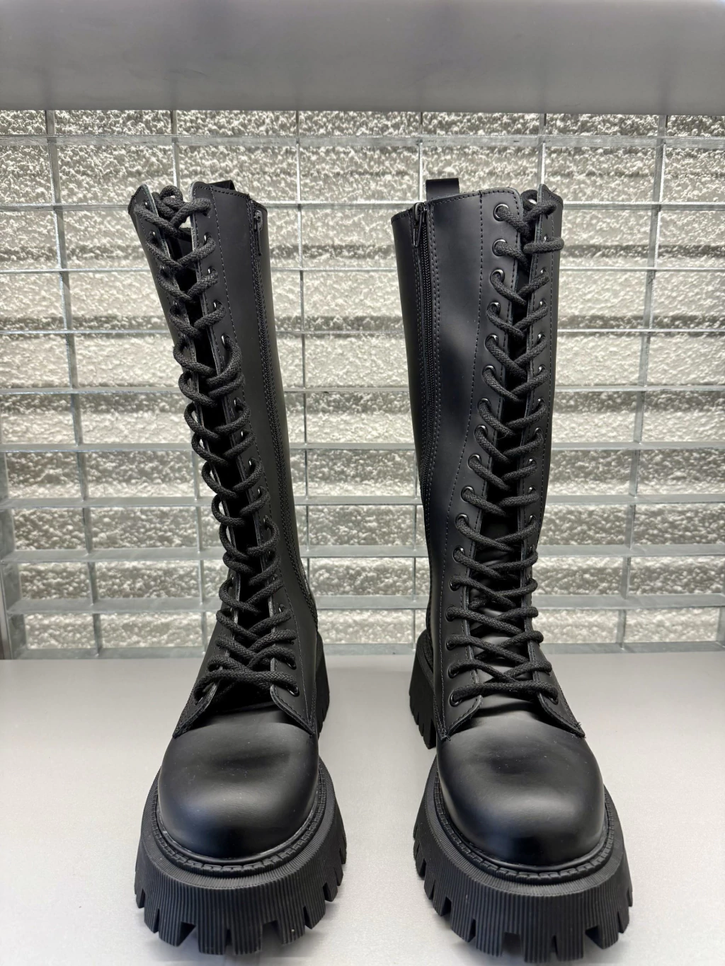 Borcego caña alta confeccionado en cuero vacuno (box) con ojalillos negros, cierre lateral interno y cordon.
