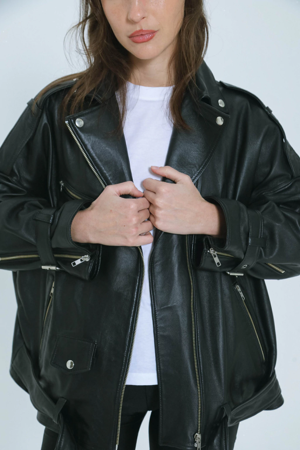 Campera oversized confeccionada en cuero vacuno;con apliques y herrajes color niquel;