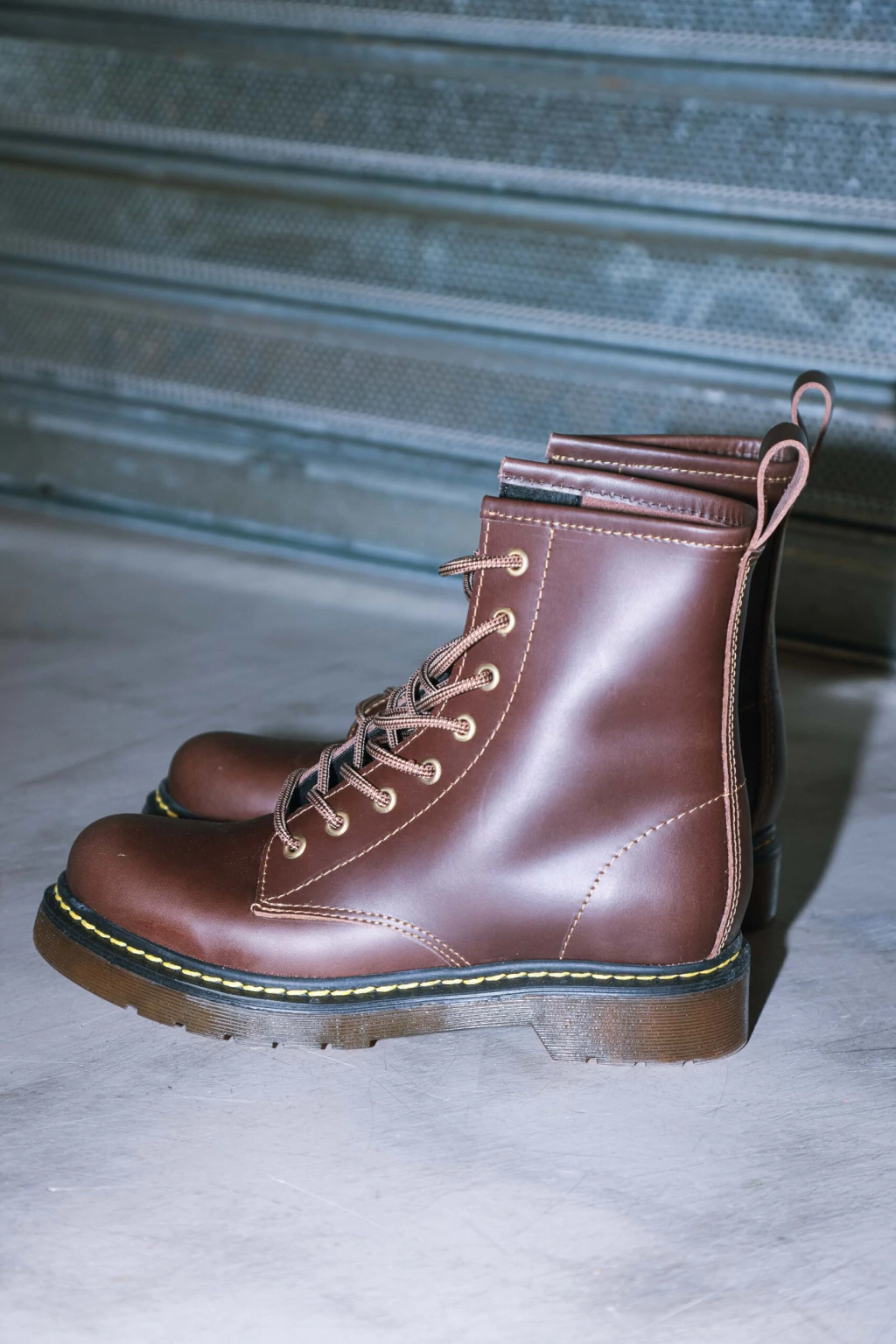 Borcego confeccionado en cuero vacuno con costura amarilla + cordon negro con pintas amarillas.
