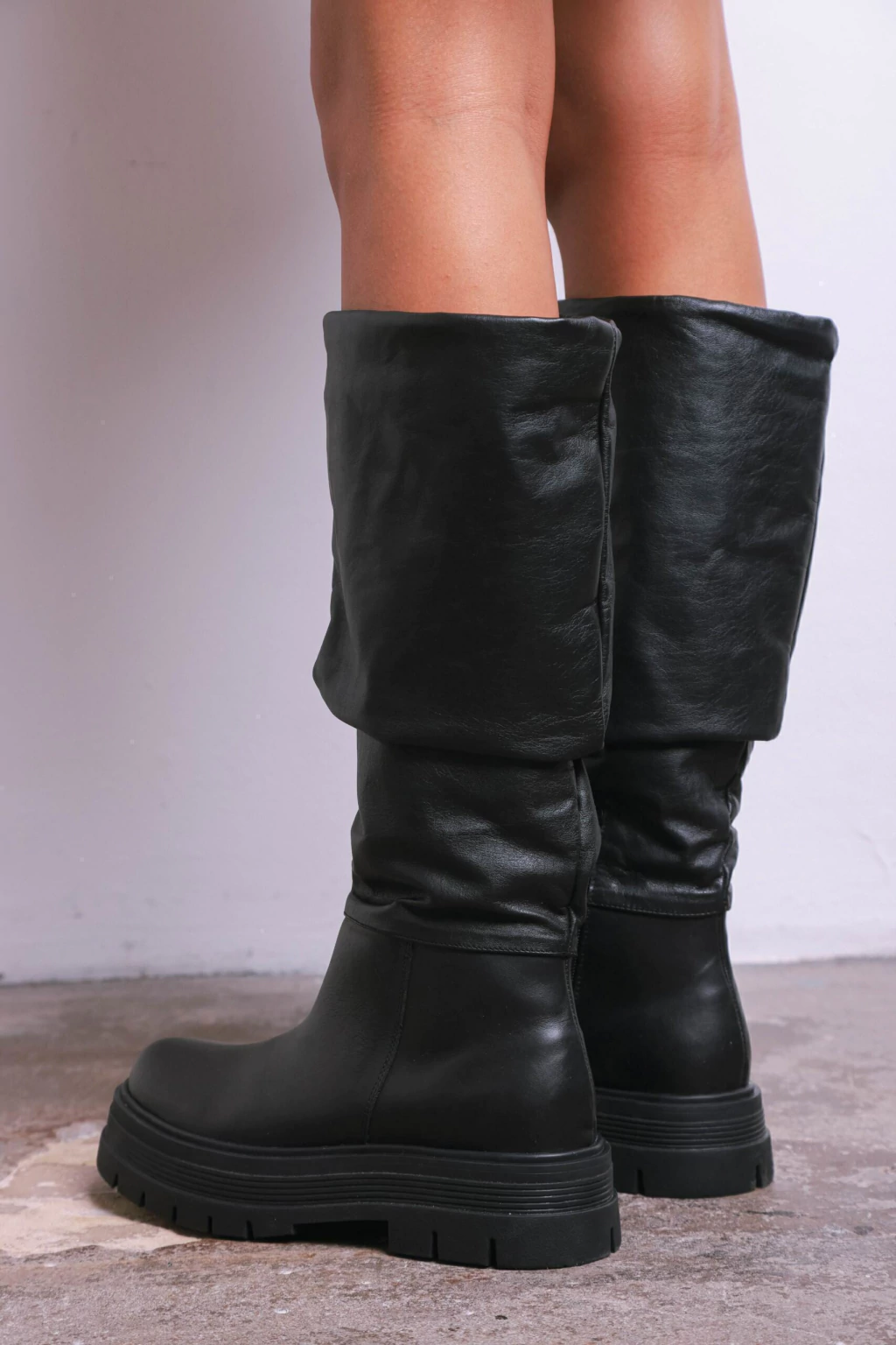 Bota caña alta confeccionada en cuero vacuno con cierre lateral y efecto arrugado.