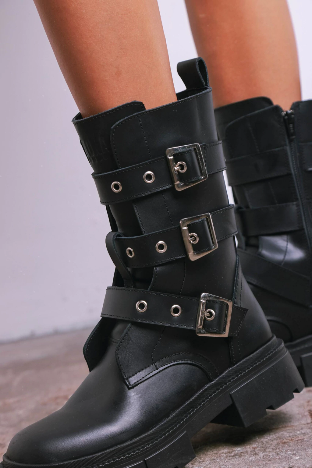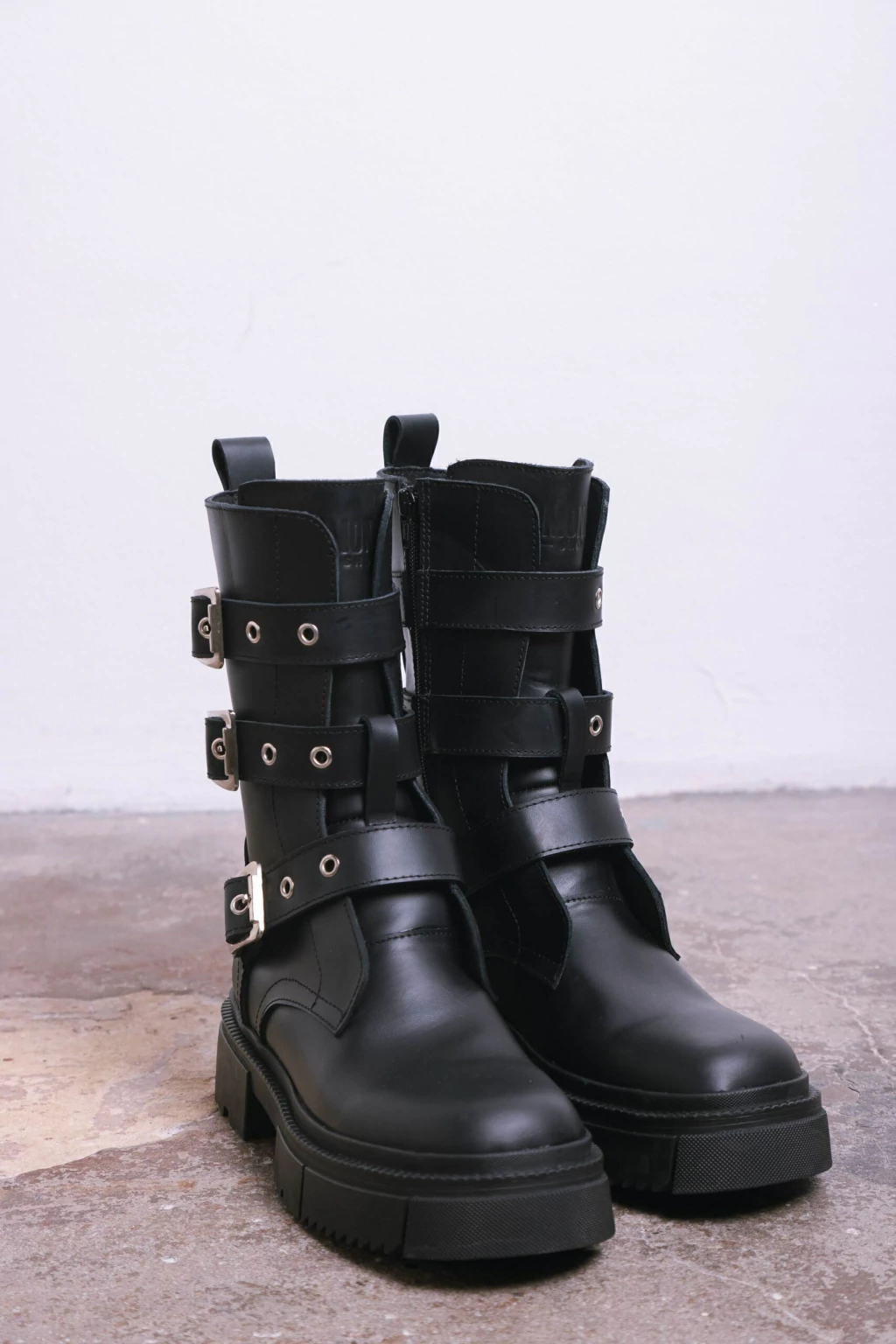 Borcego caña media confeccionado en cuero vacuno con hebillas, apliques niqueládos y cierre lateral.