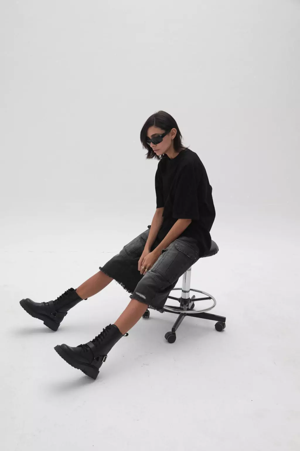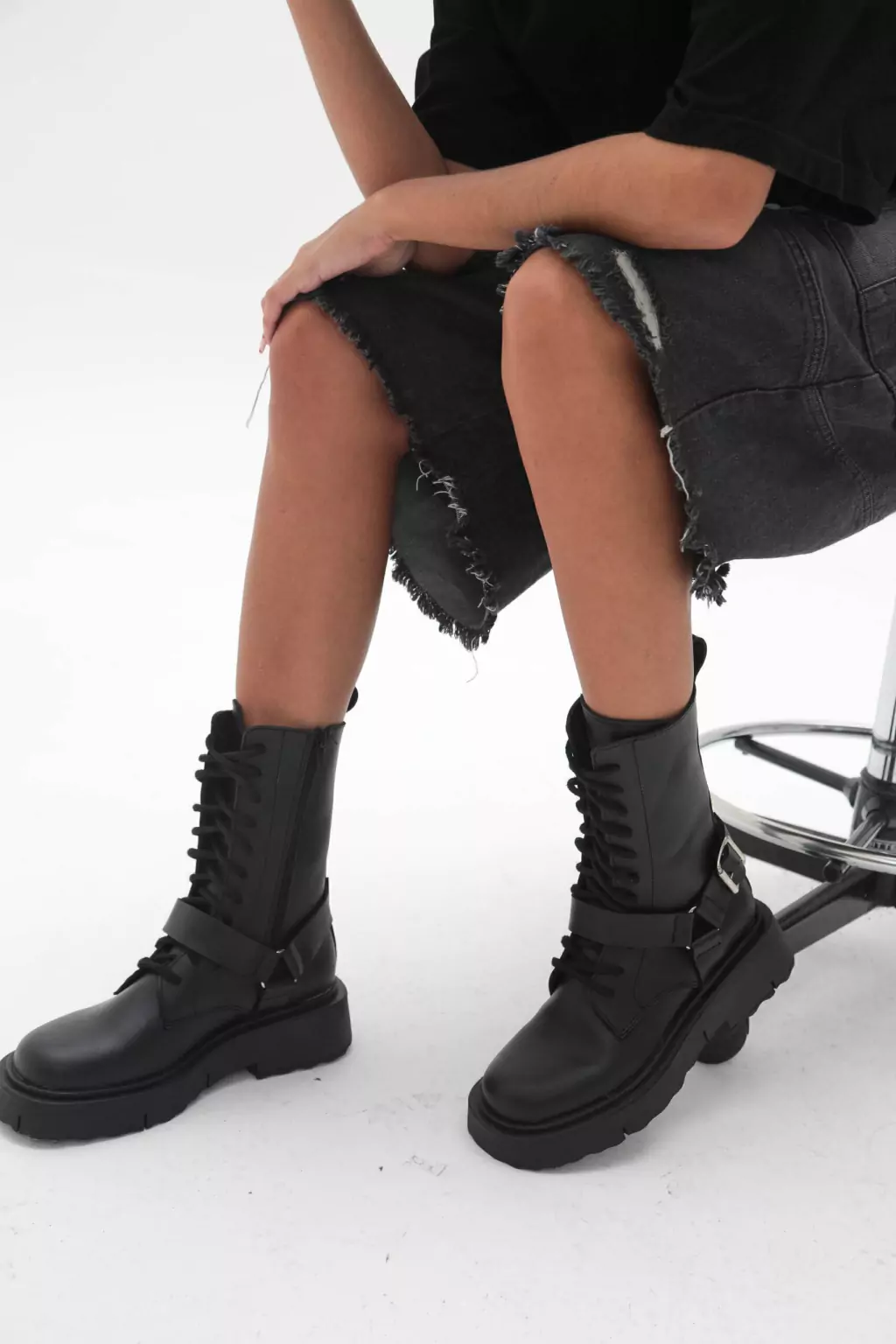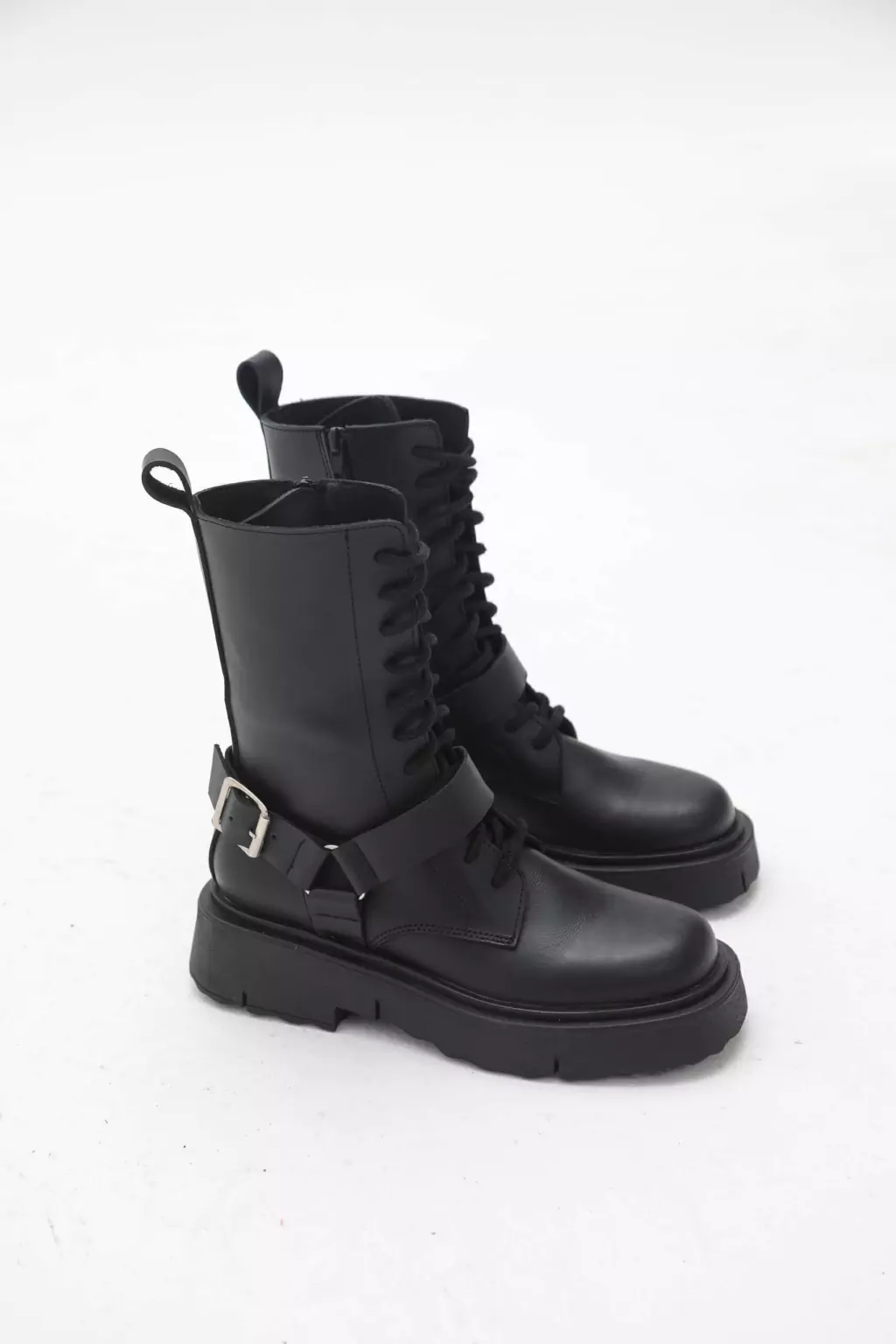 Borcego confeccionado en cuero vacuno con cierre lateral y cordones negros.